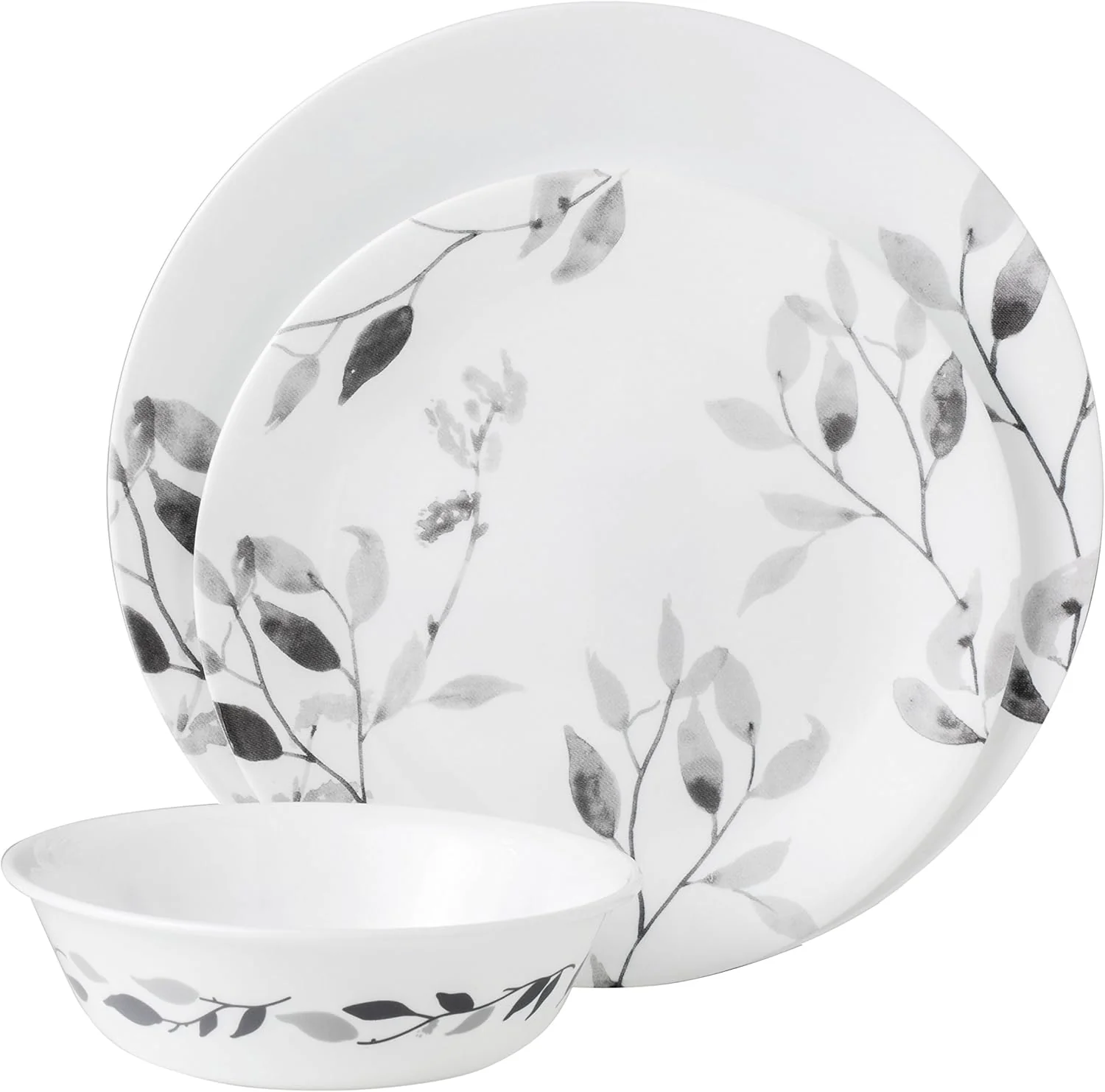 Corelle 12-Piece Vitrelle Misty Leaves Chip and Break Resistant Dinner Set, Grey