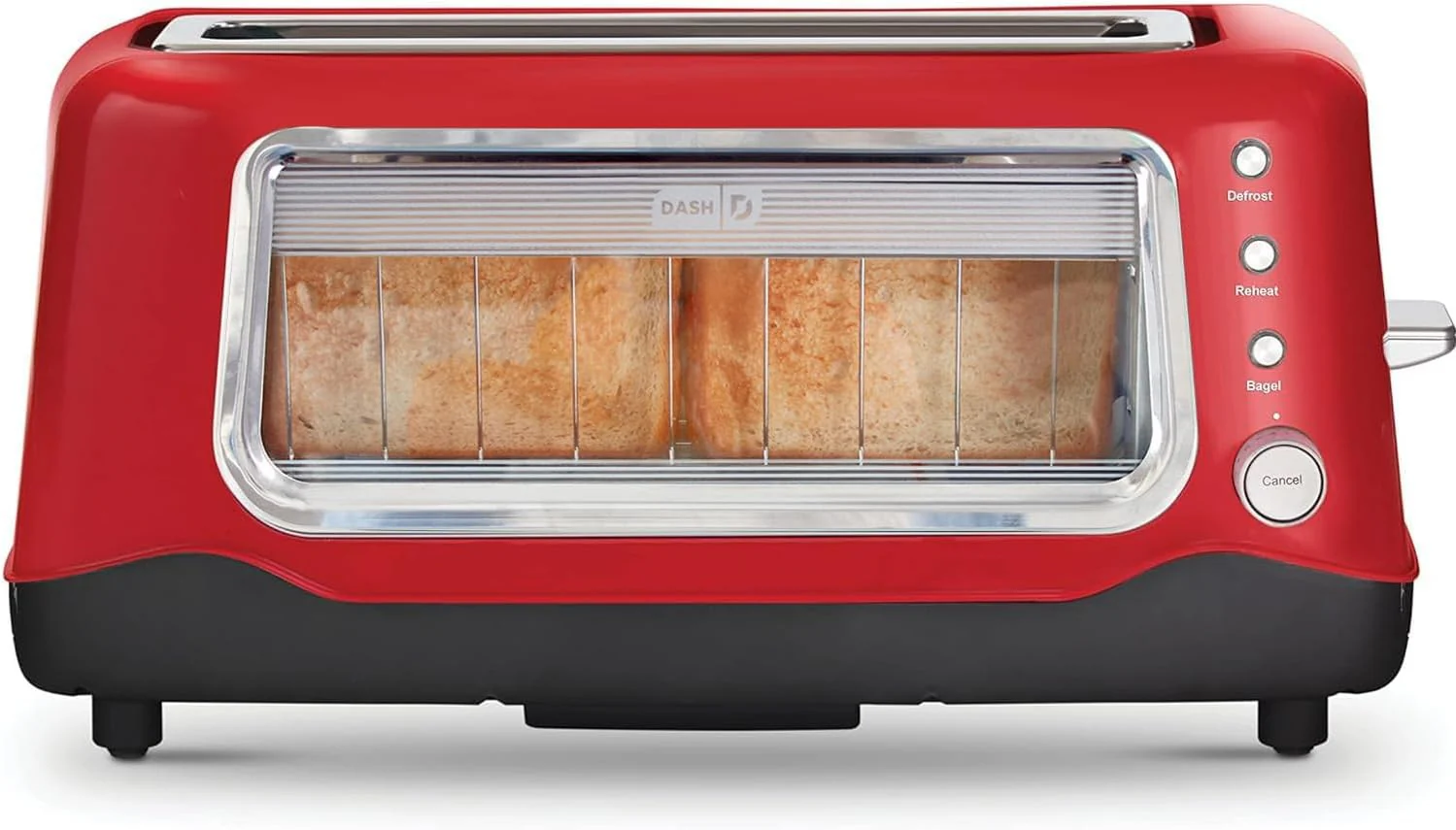 DASH Clear View Toaster - Compact Design with 7 Browning Levels & Clear-View Window, Extra-Wide Slot Large Toaster, 1-Touch Defrost, Reheat & Bagel Functions - Easy Clean Up Crumb Tray (Red)