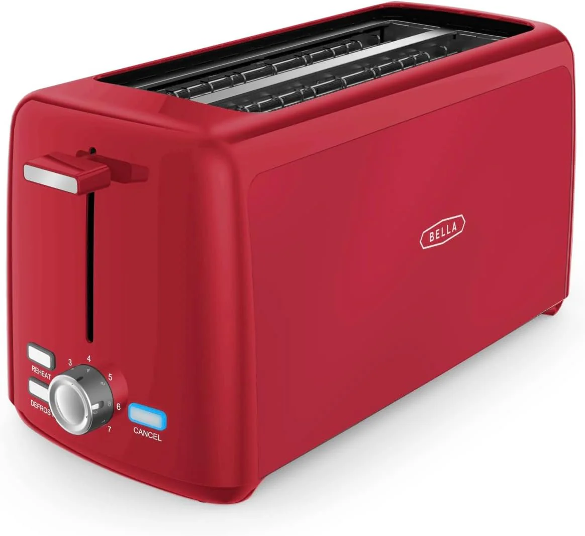 BELLA 4 Slice Toaster, Long Slot & Removable Crumb Tray, 7 Shading Options with Auto Shut Off, Cancel & Reheat Button, Toast Bread & Bagel, Red