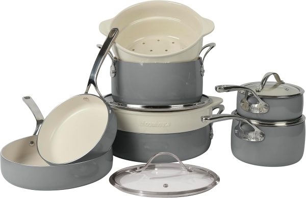 12 Piece Aluminum Pots and Pans Cookware Set w/Non-toxic Ceramic Non-stick, Ceramic Steamer Insert, 12 Protective Care Bags Stone Grey